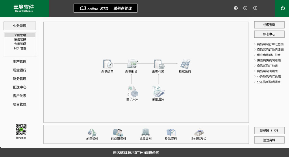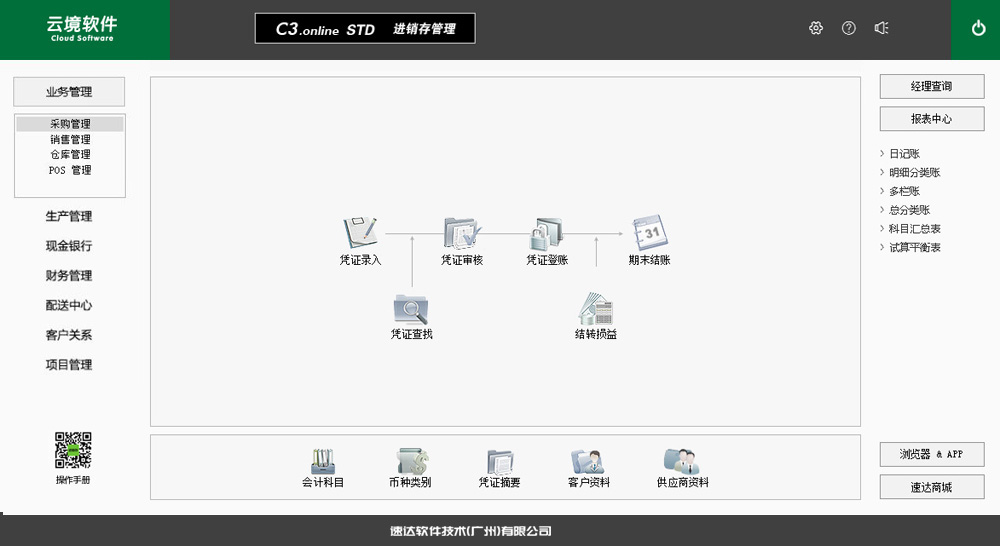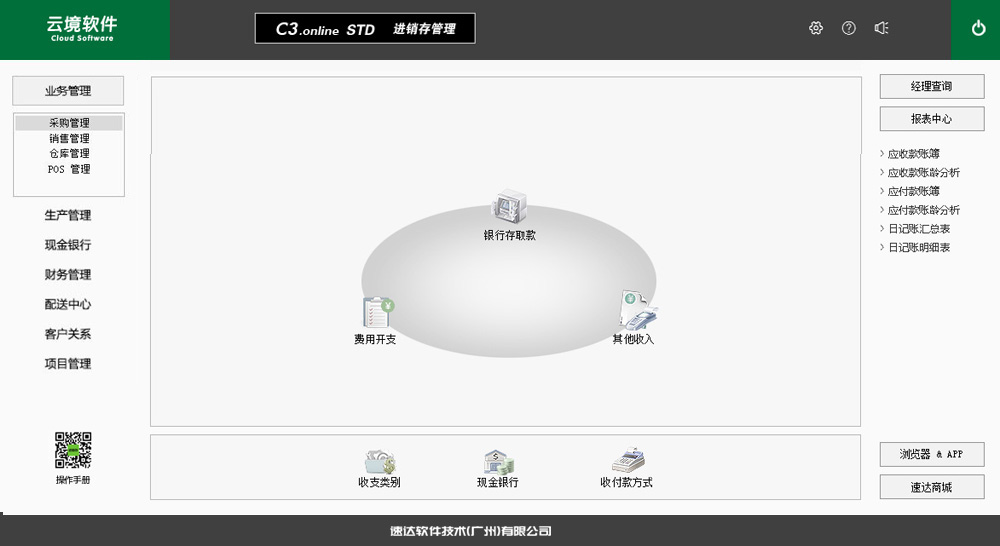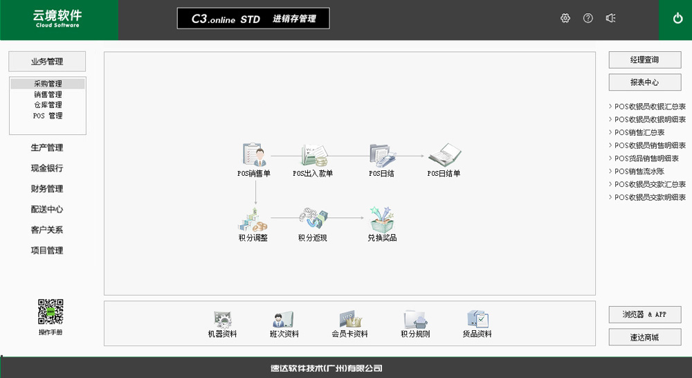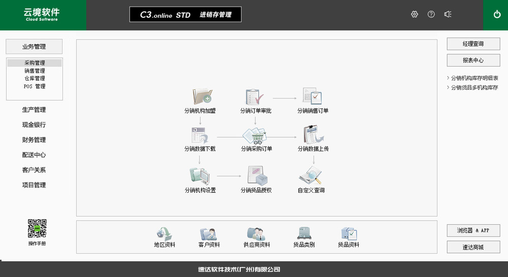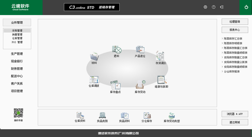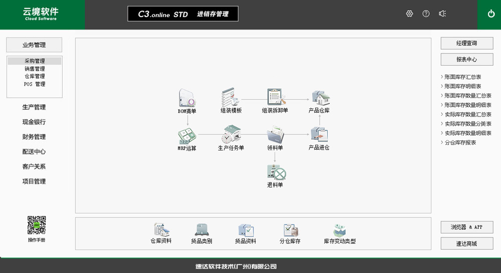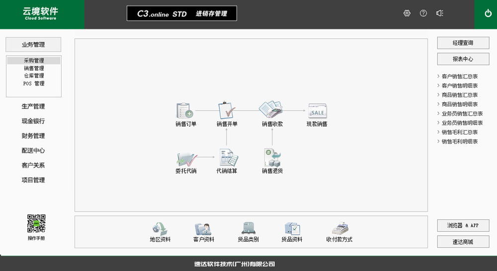 云境C3.Online STD 集进销存、POS、财务、生产、CRM为一体的中小企业管理软件。软件支持云部署和桌面服务器部署及APP部署,并科学地融入Builder-II二次研发工具,满足企业管理的个性化需求,大大提升了应用效率和安全性。 软件支持局域网/互联网多用户应用,实现异地多机构、多店面、多仓库等远程应用,支持APP移动端应用,数据实时同步,安全、稳定、高效、易维护,特别适合中小企业使用。